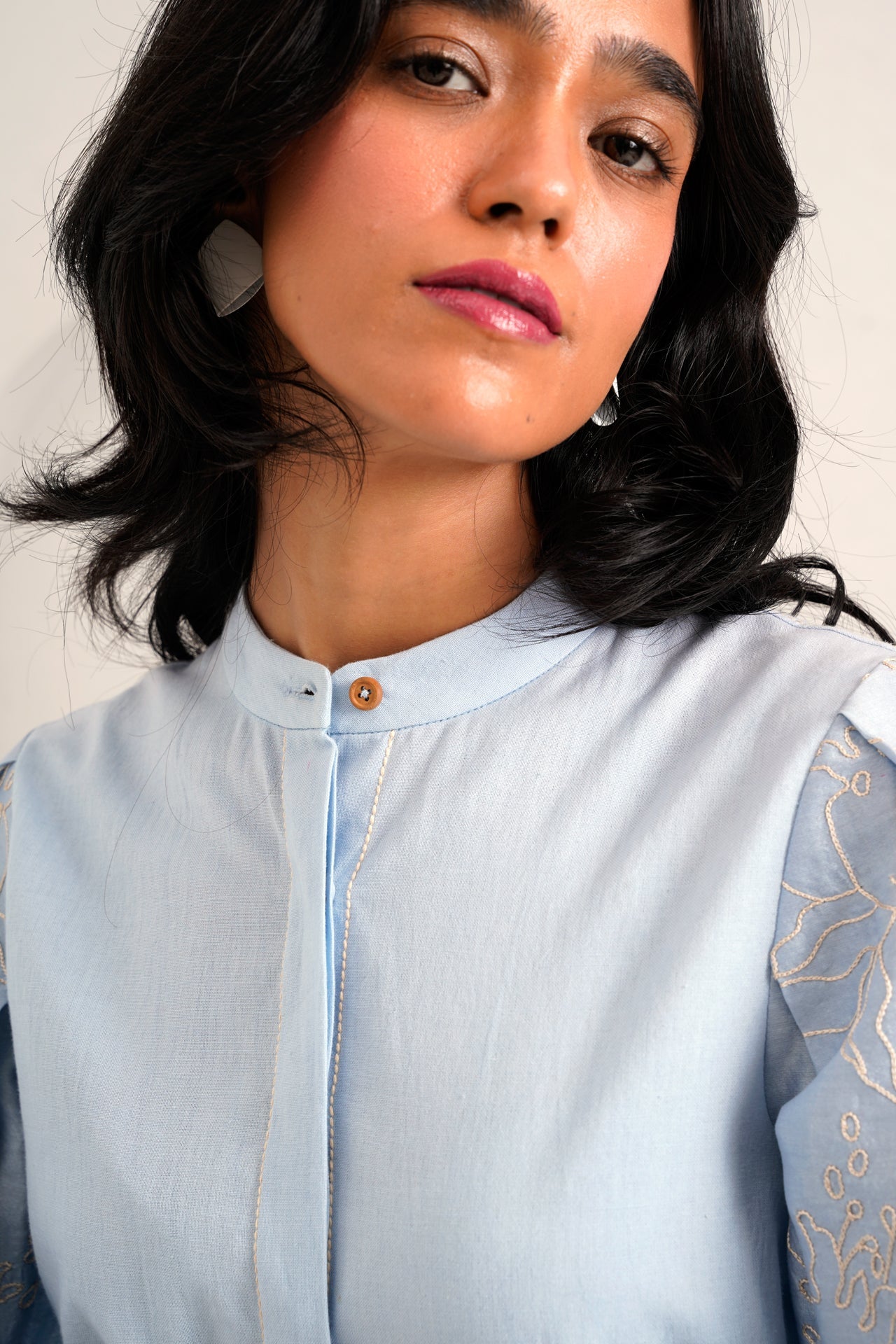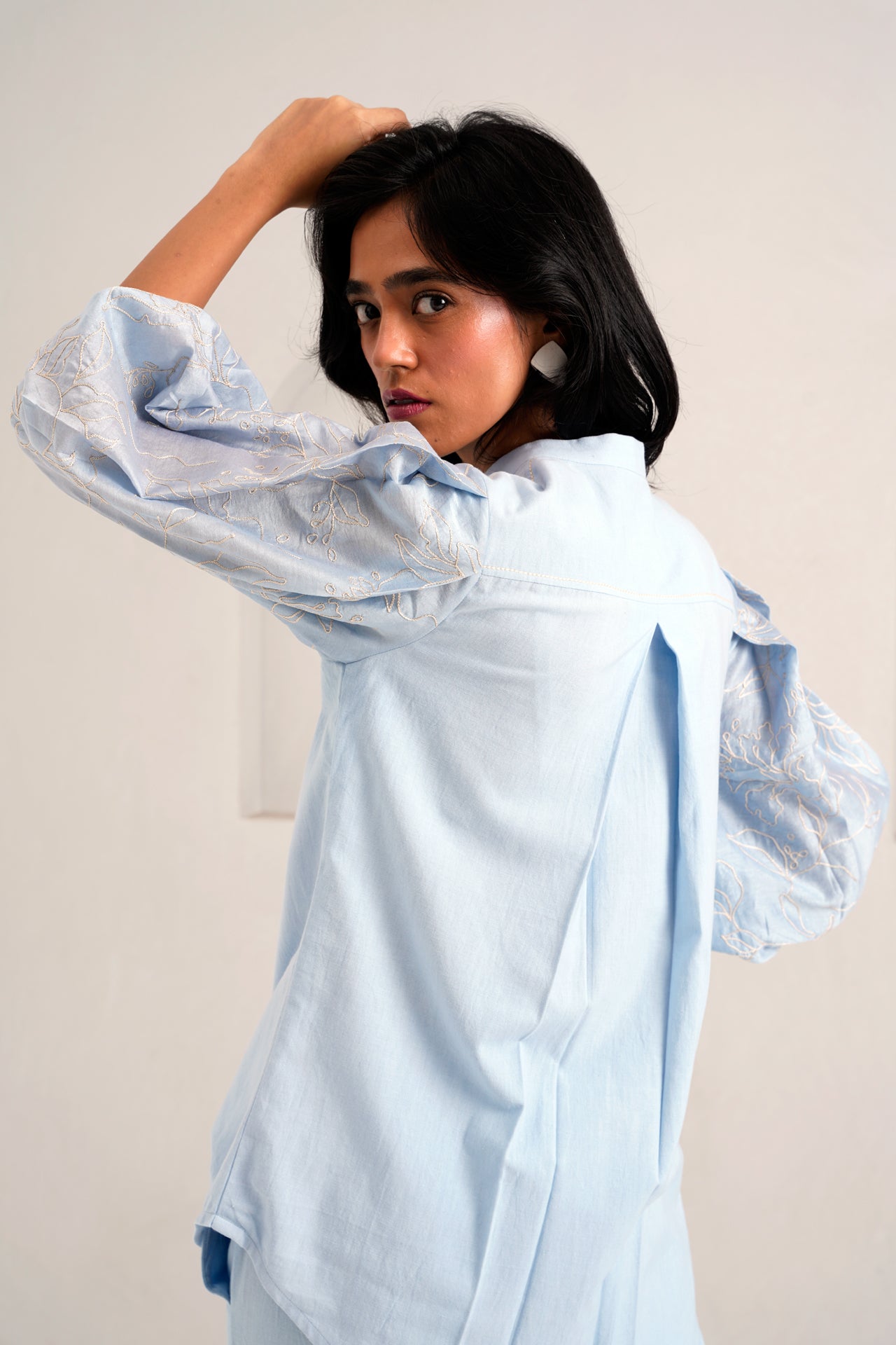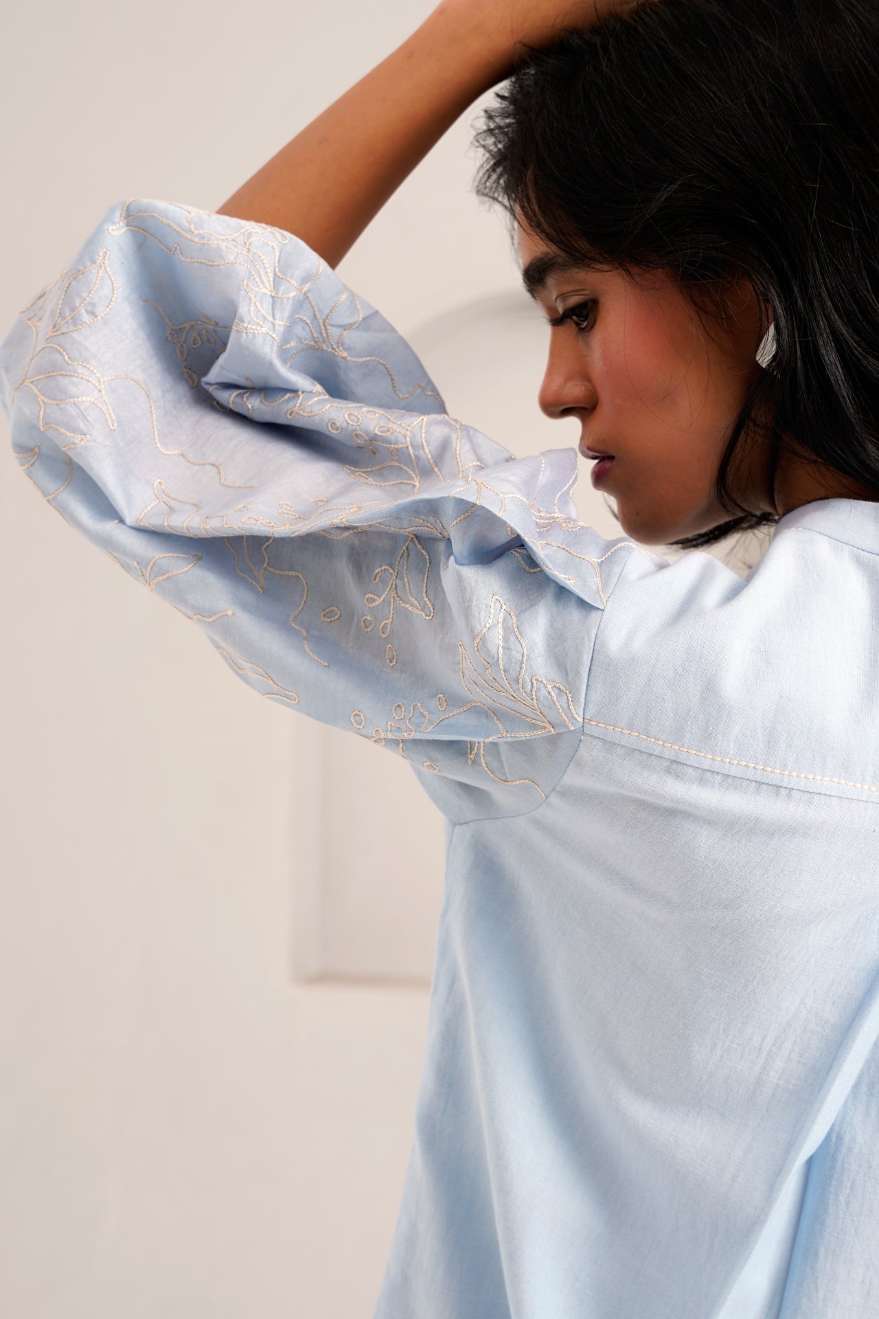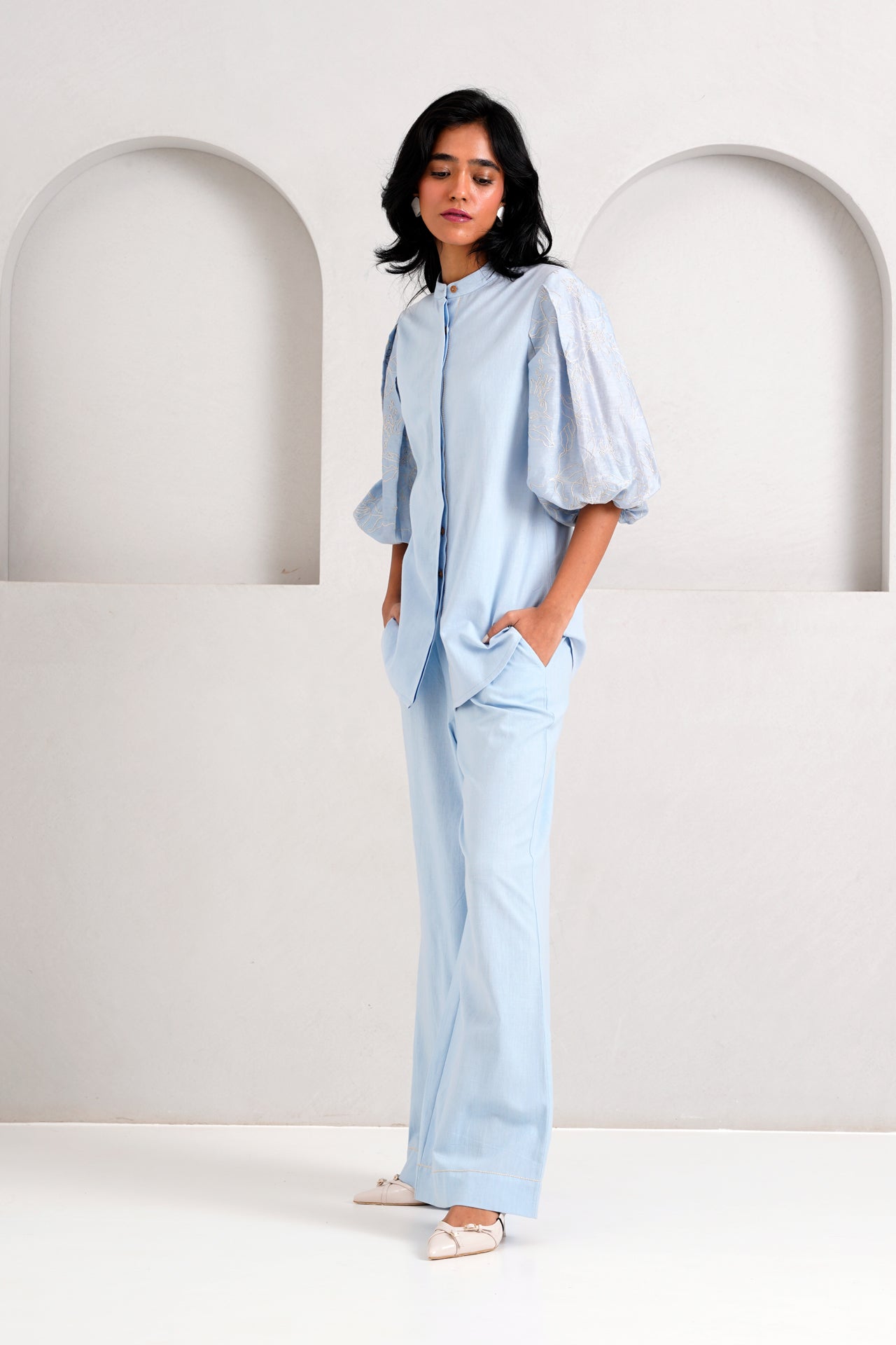 Ice Blue Oba Set - Embroidered Sleeve Top + Pants